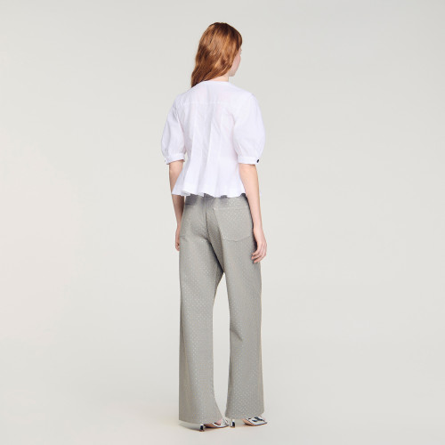 Fitted cotton peplum shirt with a V-neck, 3/4-length sleeves and a front zip fastening.